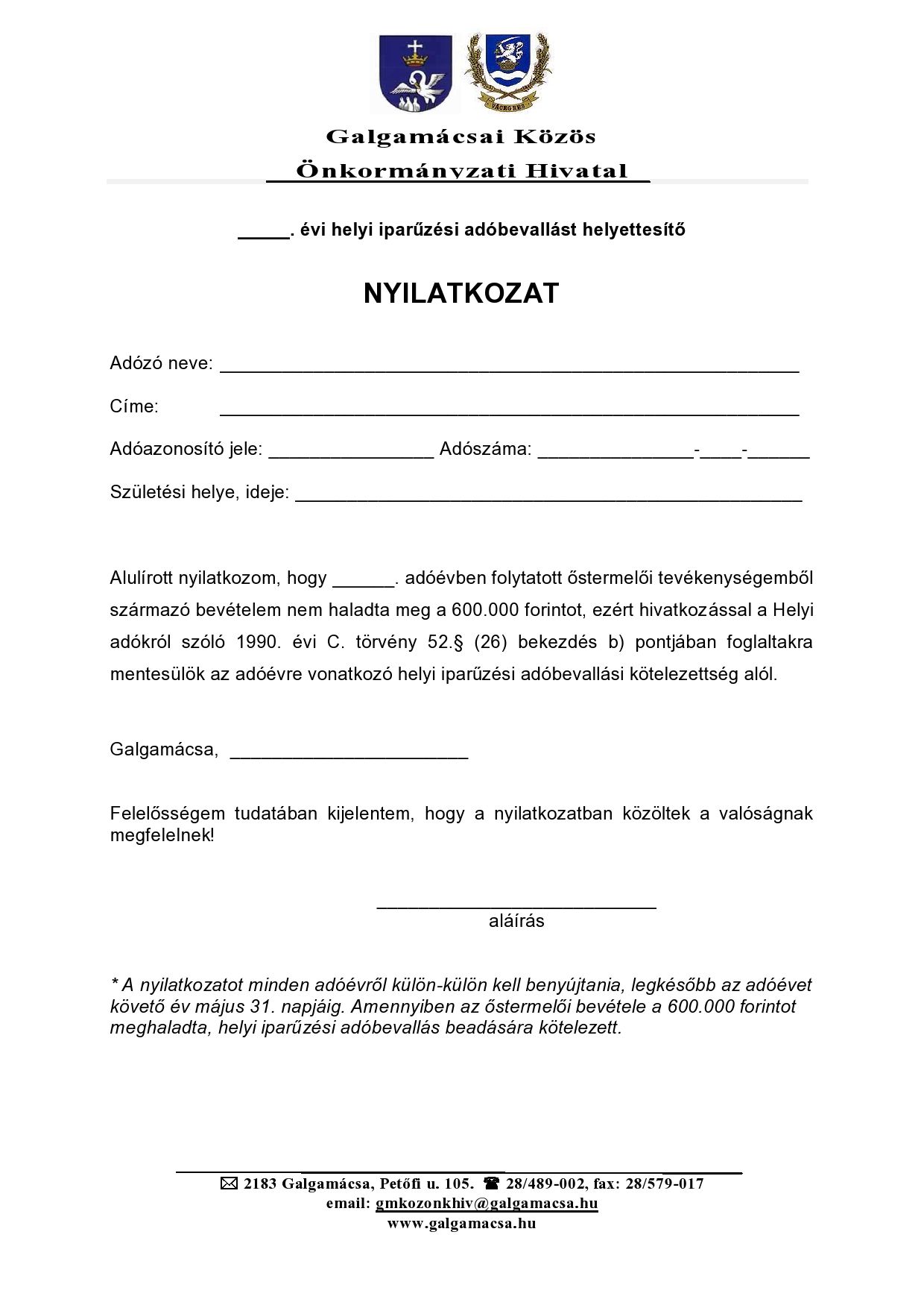 Az őstermelőnek, ha éves bevétele a 600 ezer Ft-ot meghaladja, iparűzési adó bevallási kötelezettsége is van, melynek határideje: adóévet követő év május 31-e. A bevallási kötelezettségének a honlapunkon található „Helyi iparűzési adóbevallás” nyomtatványon tehet eleget.