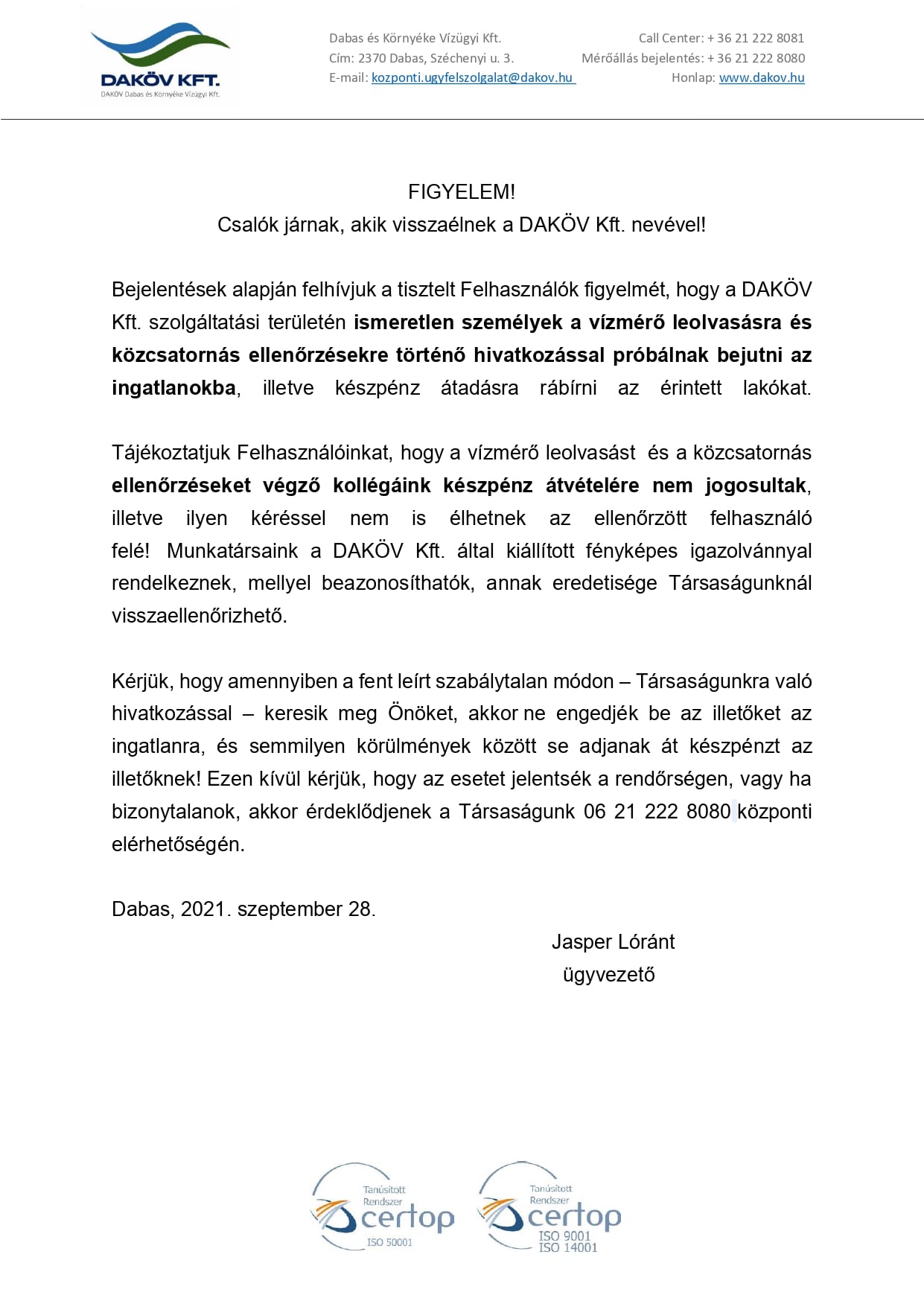 Csalók Figyelem! - Daköv tájékoztatása 2021-09-30 Tájékoztatók, felhívások, meghívók Megtekintések: 668