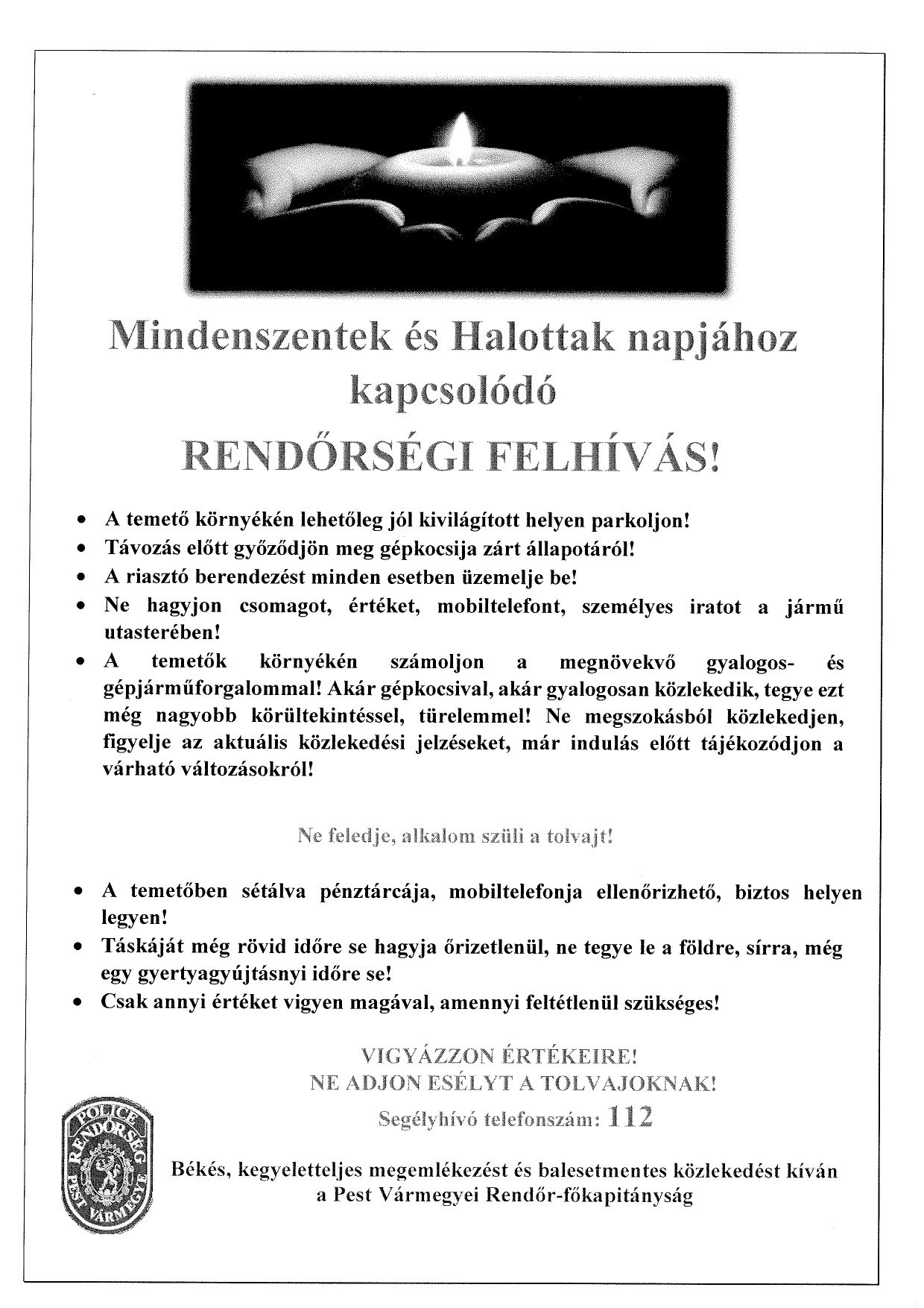 Mindenszentek és Halottak napjához kapcsolódó rendőrségi felhívás 2023-10-31 Tájékoztatók, felhívások, meghívók Megtekintések: 564
