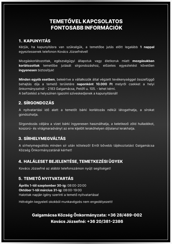 Temetővel kapcsolatos fontosabb információk